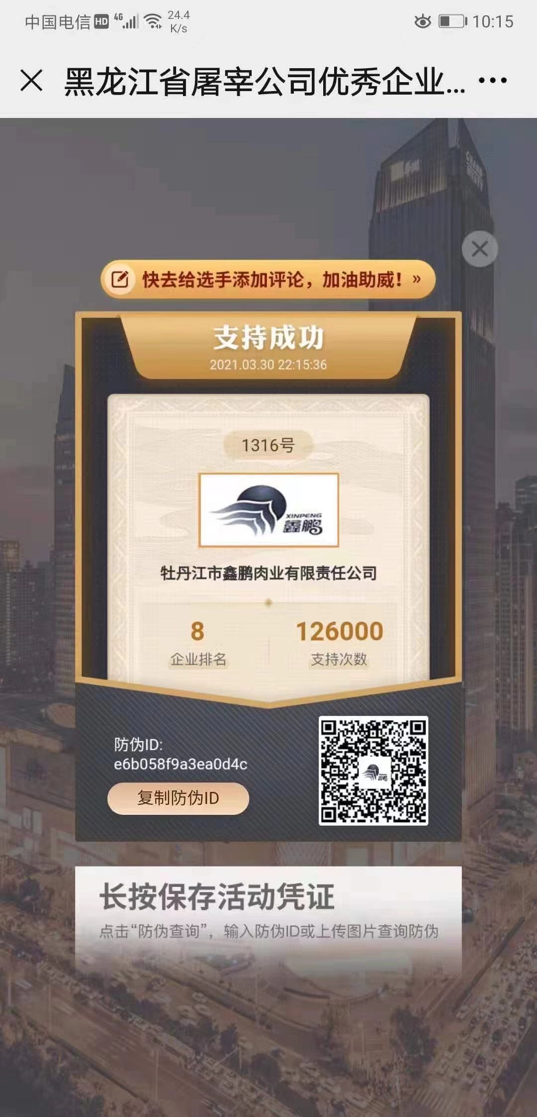 牡丹江市鑫鵬肉業(yè)有限責(zé)任公司參加黑龍江省屠宰行業(yè)誠信企業(yè)評(píng)選名列第八!鑫鵬肉業(yè)從籍籍無名到躍升問鼎,取得這份榮譽(yù),是我們共同堅(jiān)持不懈、同心同德的結(jié)果!感謝全體鑫鵬人的齊心努力!感謝摯愛親朋的鼎力協(xié)助!鑫鵬人一定不負(fù)眾望,以更好更優(yōu)質(zhì)的產(chǎn)品回饋家鄉(xiāng)!回饋社會(huì)!